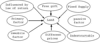 Definition :- "By land means the material goods and the resources which 'nature' gives freely for man's aid, in land and water, in air and light and heat"- Marshall Peculiarities :- (I) Fixed supply : Total land supplied by nature can not be increased. The only way to increase its supply is to make intense use of land. (ii) Free gift of nature : Land is free gift of nature. Man has paid nothing to God for this. (iii) Indestructible factor : Land cannot be destroyed, but its shapes can be changed and its productivity can also change. (iv) Passive factor : Land is a passive factor of production because it cannot produce any thing by itself and man has to invest money and apply labour to get production from it.