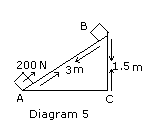 Q 2(a) A block of mass 30 Kg is pulled up a slope (Diagram 5 below) with a constant speed by applying a force of 200 N parallel to the slope. A and B are initial and final position of the block.